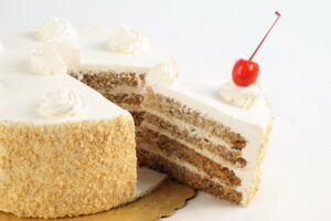 Light white cake soaked in coffee and rum syrup, layered with tiramisu mousse, frosted with whipped cream, and finished with cocoa powder and chocolate shavings. A dreamy Italian classic.