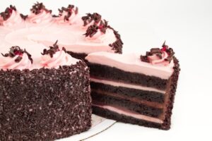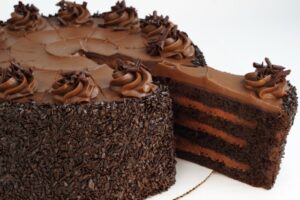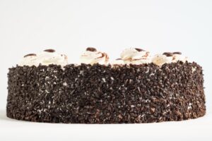 Moist chocolate cake soaked with stout-infused syrup, layered with silky chocolate mousse, frosted in smooth chocolate ganache—a rich blend of cream and chocolate—and finished with a coat of chocolate crumbs. Deep, bold, and unapologetically decadent.