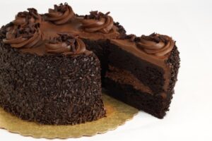An ultra-rich chocolate cake with a velvety, flourless crumb, wrapped in ganache and fudge icing, and topped with dark chocolate sprinkles, fudge rosettes, and elegant chocolate filigrees. While made without flour, please note our facility is not gluten free!