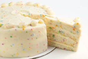 Soft white cake layered with bright lemon mousse, topped with a light swirl of buttercream and a smooth lemon cream cheese finish. Big enough to share… but make no promises!