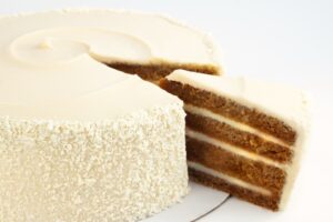 Award-winning carrot cake with raisins and walnuts, layered with velvety cream cheese frosting, topped with elegant rosettes, and finished with a graham crumb edge. A timeless favorite with a winning touch.